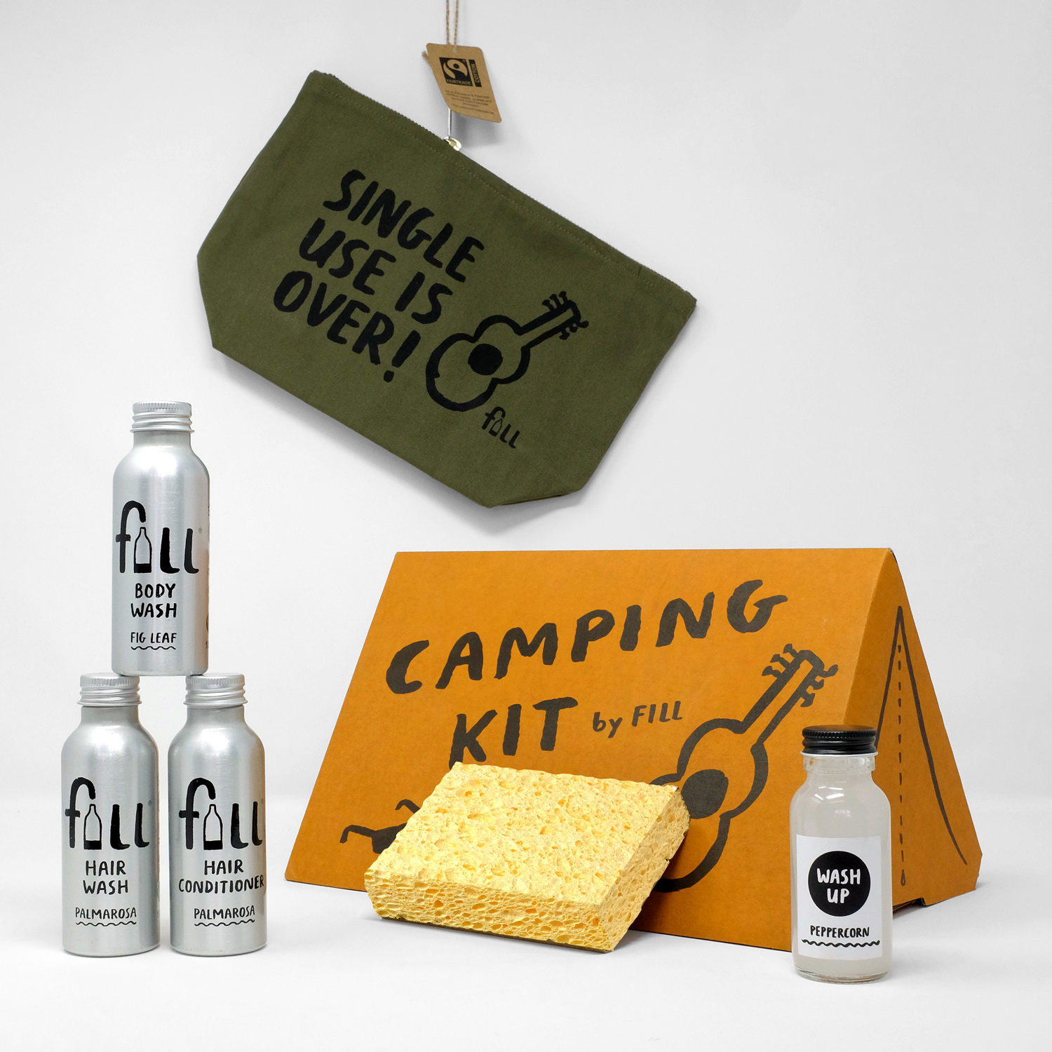 1x Fill Wash Bag – Fairtrade organic cotton, olive green with black screen print.